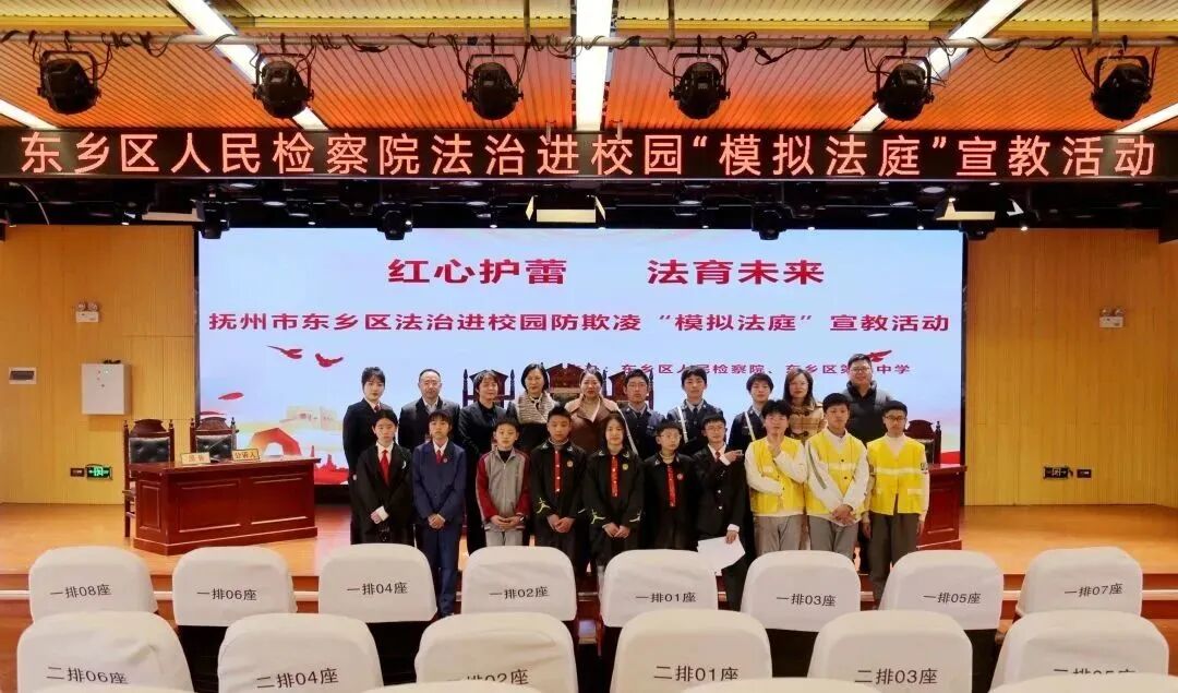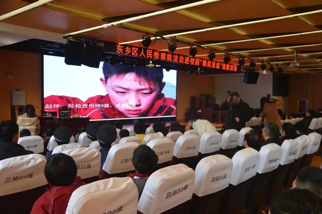 为净化校园成长环境,深化法治副校长校园普法活动实效, 2月21日上午,东乡区人民检察院走进东乡二中,组织开展“红心护蕾·法育未来”法治进校园防欺凌模拟法庭宣教活动,区委常委、政法委书记李建平,区检察院党组书记、检察长揭玫,市检察院第七检察部主任杨希,市检察院政治工作综合处副处长何茶花,区妇联党组书记,主席程燕萍,团区委书记饶文锋和“红心护蕾·刘莹姐姐”未成年人保护工作中心各成员单位分管领导莅临活动现场。
