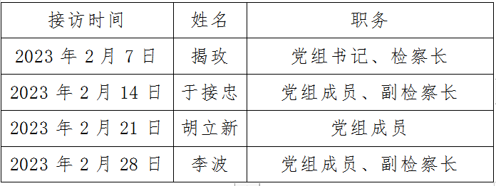 为深入贯彻习近平法治思想,践行新时代检察机关以人民为中心的发展理念,畅通群众诉求渠道,现将东乡区人民检察院2023年2月份检察长接访安排公告如下: