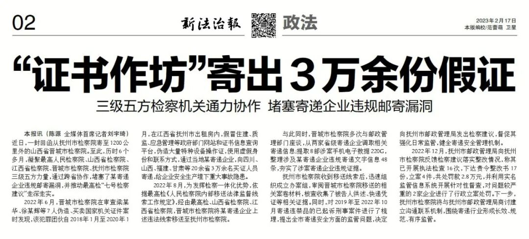 2022年6月,晋城市检察院在审查梁某某、徐某某等7人伪造、买卖国家机关证件案时发现,该犯罪团伙自2018年1月至2020年1月,在江西省抚州市出租房内,假冒住建、质监、应急管理等政府部门网站和证书信息查询平台,伪造大量特种设备操作证,使用虚假身份和联系方式,通过当地某寄递企业,向四川、山西、福建、甘肃等20余省3万余名买证人员寄递,给企业安全生产埋下重大事故隐患。